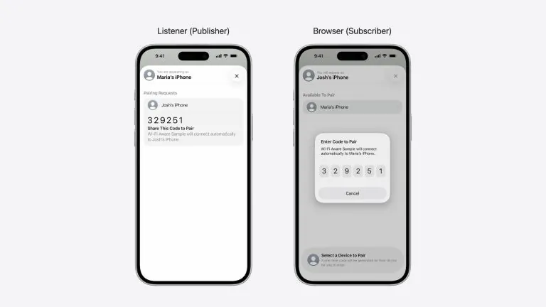 在 WWDC25 全球开发者大会的“利用 Wi-Fi Aware 增强设备连接”环节中,苹果的 Swetank Saha 展示了这一功能:用户只需在双方设备上打开应用,获取附近设备的列表,点击即可发起连接。与 AirDrop 类似,系统还提供了可选的确认码步骤,以确保用户连接到正确的设备。